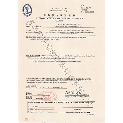 中國(guó)船級(jí)社服務(wù)供方認(rèn)可證書(shū)